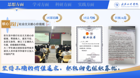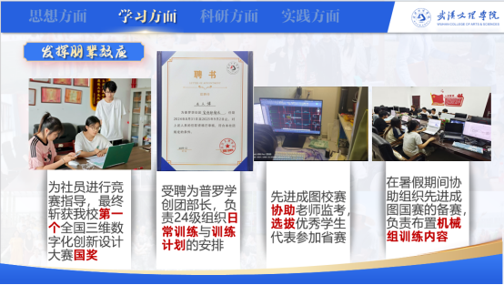 作为普罗学创团部长、演讲与口才协会部长,石文博为社团成员进行技能培训与竞赛指导,助力多支队伍首次获得省奖和国奖,学院竞赛参与率显著提升。他还参与拍摄学校招生宣传片、组织校CAD大赛、打造创新实验室,积极组织社团活动。